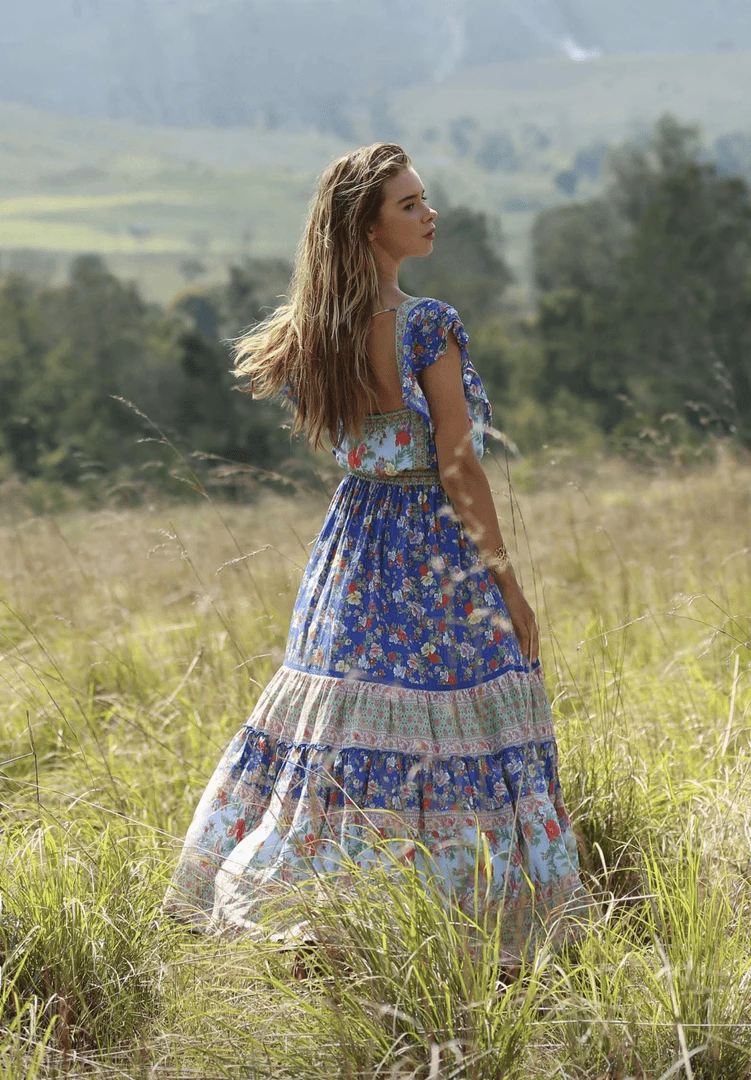 Introducing the stunning Hannah Maxi Dress in our glorious new print. This gown has an exquisite vintage vibe reminiscent of the 1970s. Made from our soft rayon and bursting with colour, this dress is sure to become a favourite. Featuring a flattering peasant-style bodice and slightly cutaway back with a tassel tie, this dress is feminine and gorgeous. Flutter sleeves add to the vintage feel, along with our elastic waist for that perfect fit. Perfect to dress up or down, you will be reaching for this stunning piece day after day. Featuring our stunning Lost in Paradise print with vibrant flowers, this gorgeous dress is available in three colour ways, Rococo Red, Lapis Lazuli and Lotus.