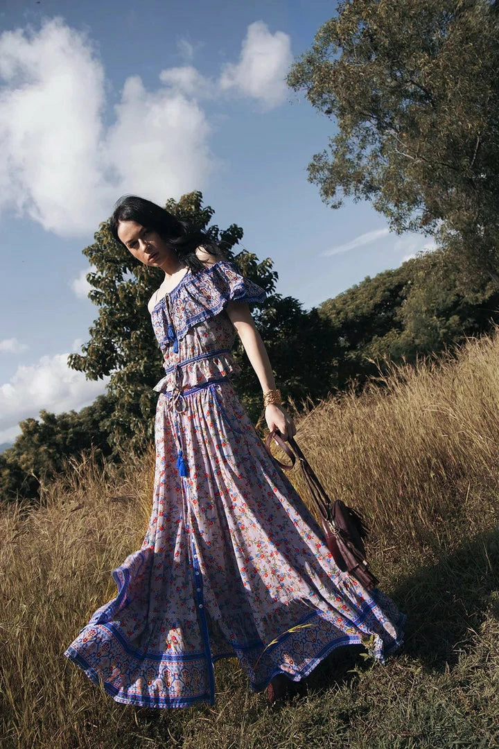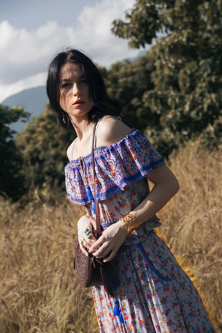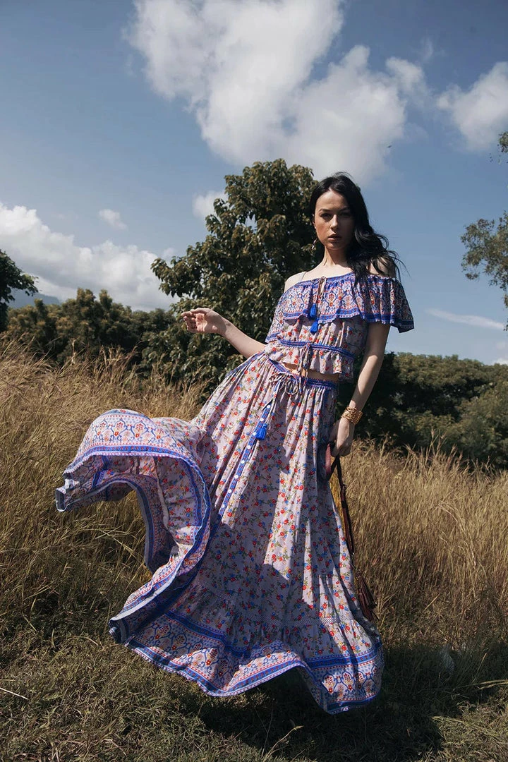 Our beautiful Jolie Maxi Skirt is set to become your new boho wardrobe favourite. Made from the softest rayon and featuring our whimsical Ditsy Charm wildflowers print, this skirt is perfect to pair with our crop tops for the ultimate gypsy look. Mix and match with different prints and colours to create beautiful and versatile outfits. Wear it with your favourite tee and white sneakers for perfect everyday style. The skirt features our essential elastic waist for fit and comfort and cascading tiers of lavish fabric ready to catch the breeze for that perfect swish.