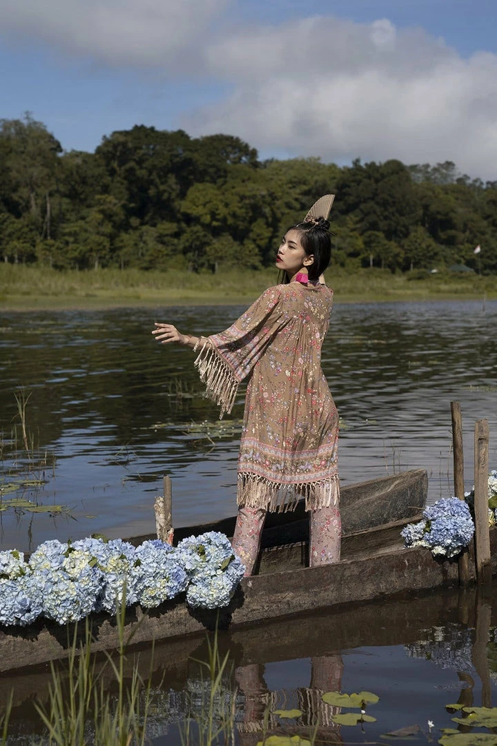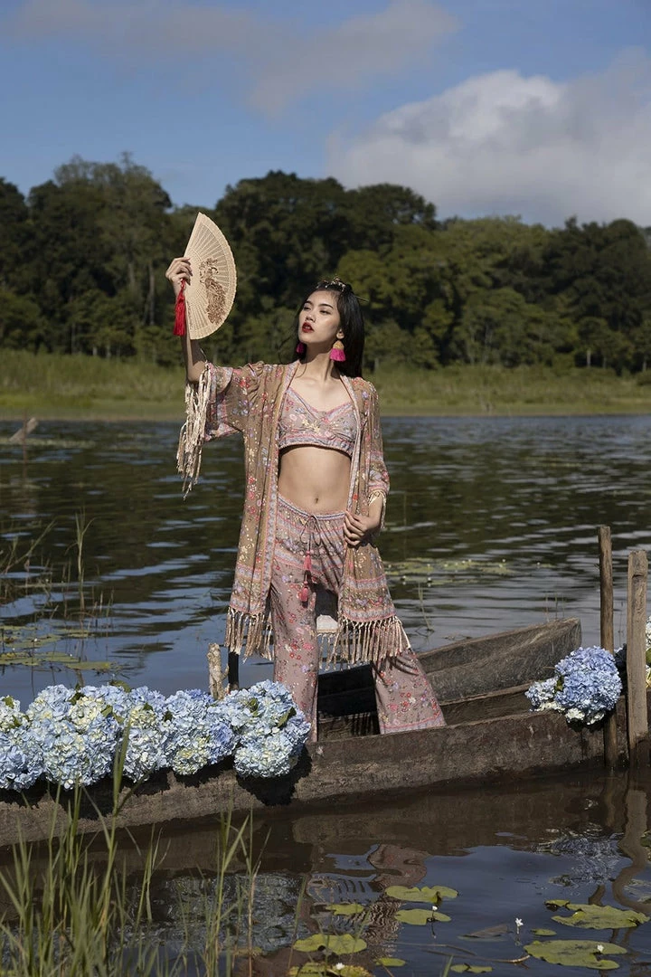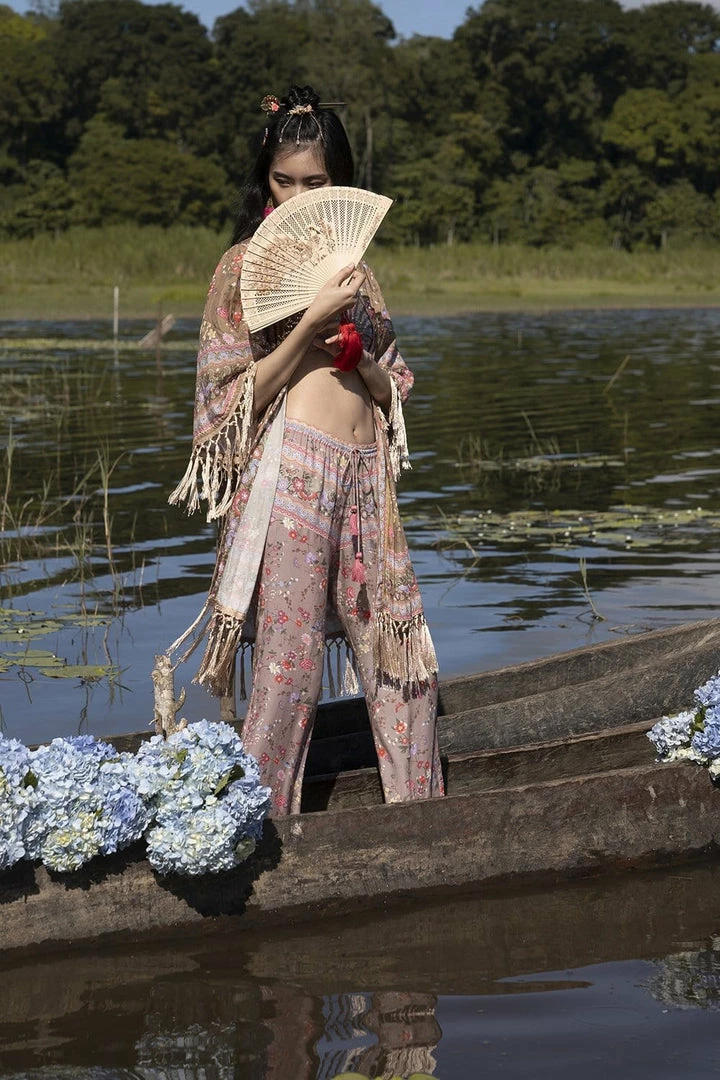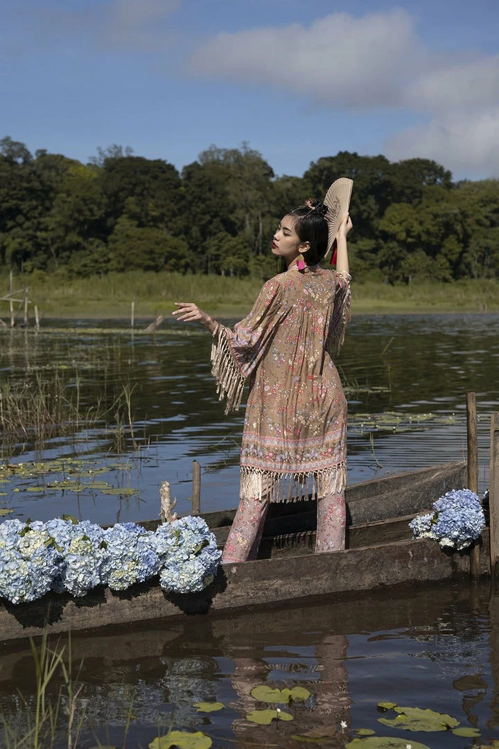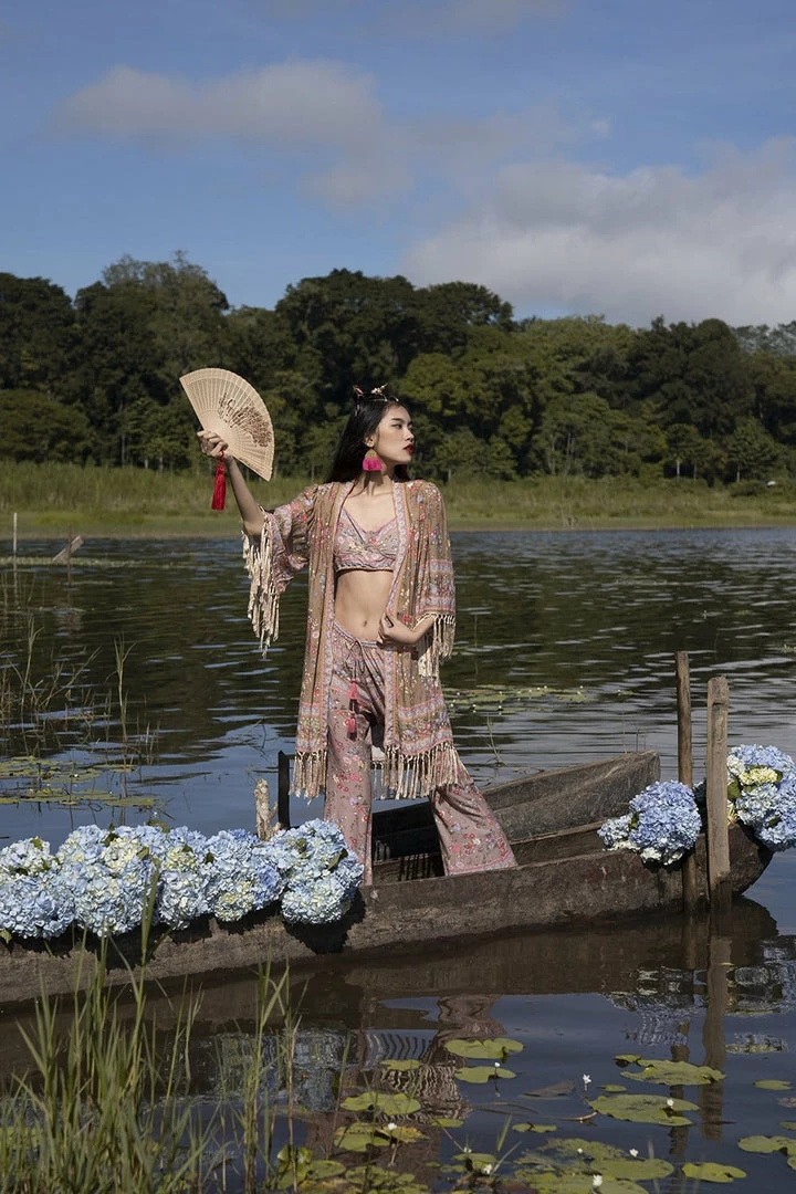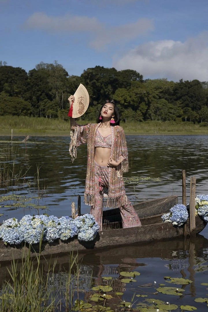 Your search for the perfect kimono robe is over! This exquisite piece is the absolute must-have of this collection. Inspired by romantic vintage chinoiserie fabrics and sprinkled with blooms and butterflies, you will want to wear this with everything!