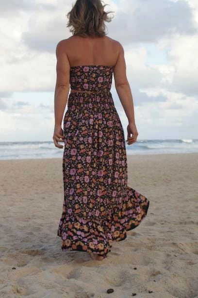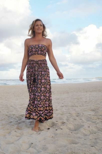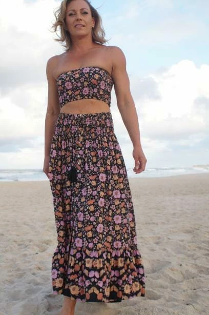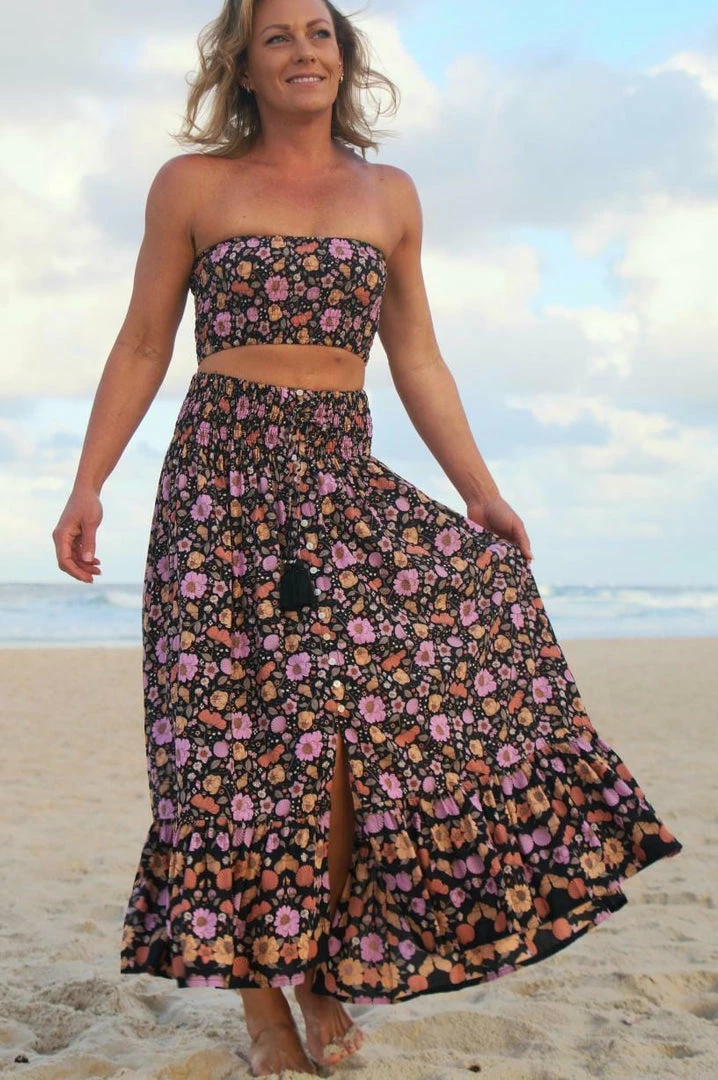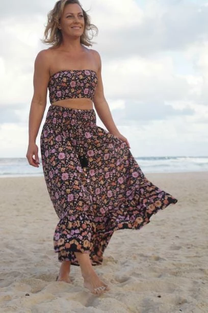 Nothing screams Spring-ready more than Floral and Seashell  prints! The ‘Samba Skirt’ features a black with multi toned floral and seashell print, maxi length, tiered ruched detailing, stretch across waist and overall relaxed fit.